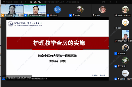 河南中医药大学第一附属医院骨伤科一病区尹夏护士长分享教学查房经验,她从护理查房的概述、基本要求、实施程序及注意事项五方面进行了阐述,随后,一附院护理部彭晓燕副主任、罗慧敏老师、二附院护理部张琰护士长、三附护理部院翟晓静副主任、郑州人民医院护理部赵玉洁副主任作为代表,重点就教学查房形式、实施细节、床前查房内容、中西医融合及带教老师如何引导等做了深入讨论。