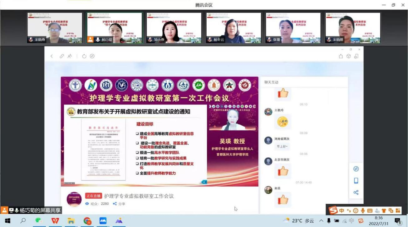 本网讯(文/马梦圆 图/宋晓燕)为贯彻落实“十四五”教育发展规划有关部署,加快虚拟教研室建设,进一步提高教育教学水平,2022年7月31日,beat365 手机版官方网站开展暑假教学能力提升系列培训第二课,组织学院任课教师全程线上参加了由首都医科大学主办的护理学专业虚拟教研室“四个一”系列活动。